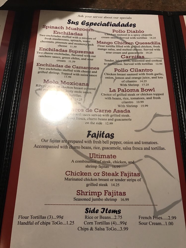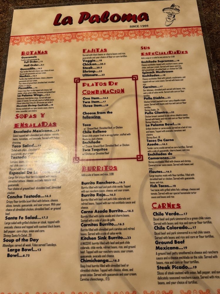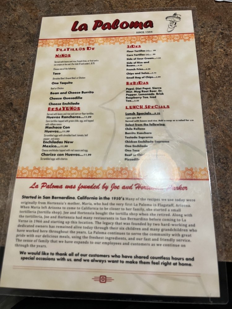 La Paloma Restaurant is a charming Mexican eatery in La Verne, CA. This woman-owned establishment offers a range of traditional Mexican dishes with a twist. From flavorful botanas like the Guacamole with Chips & Salsa to mouth-watering Fajitas, La Paloma Restaurant has something for everyone. The cozy atmosphere and attentive service make dining here a delightful experience. Notable reviews mention the owner's friendly demeanor, delicious beef rojo, and the unbeatable Monday margarita deals. With a menu that caters to vegetarians, happy hour specials, and environmentally-friendly practices like plastic-free packaging, La Paloma Restaurant goes above and beyond to ensure a pleasant dining experience for all. Don't miss out on this gem for a taste of authentic Mexican cuisine with a modern flair.